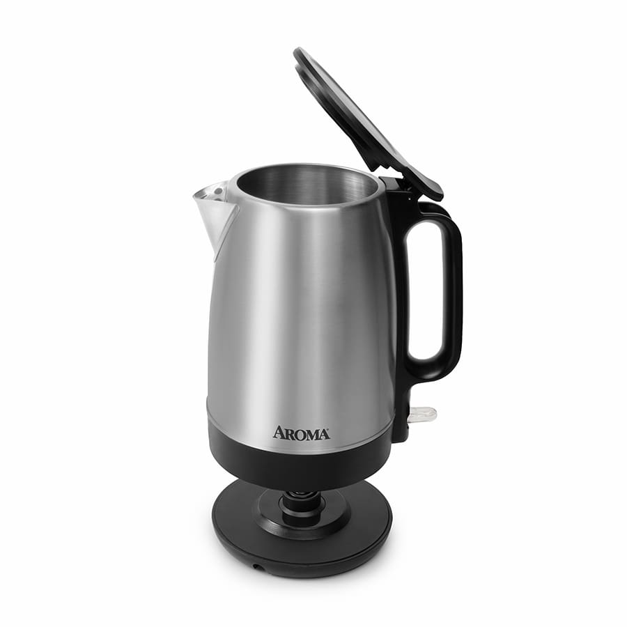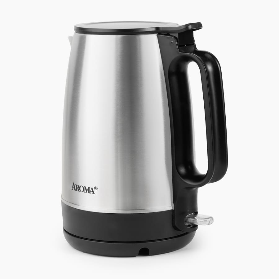 Press the tab on top to lift the lid and easily add up to 7 cups of water in the large electric tea kettle. We redesigned the hinge lid with a modern, flat design that fits better in small cabinets. Plus, the stainless steel electric kettle can spin 360° on the slim power base, so it’s perfect for tight spaces. The best electric tea kettle starts with a touch and switches off automatically, so you don’t have to watch or wait. Powerful heat brings water up to a rapid boil, then the kettle’s power switch resets to the ‘off’ position. Grab the long, stay-cool handle and lift off the power base to pour and serve with a drip-free spout. With non-reactive stainless steel and BPA-free plastic finishes, Aroma helps enhance the clean, bright flavor of your favorite drinks.1.69 lbs