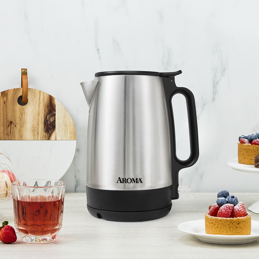 Aroma’s 1.7-liter stainless steel electric tea kettle has a new, space-saving design and shining exterior. Now you can boil 1 cup of water in just 1 minute and sip even faster with a rapid boil kettle!