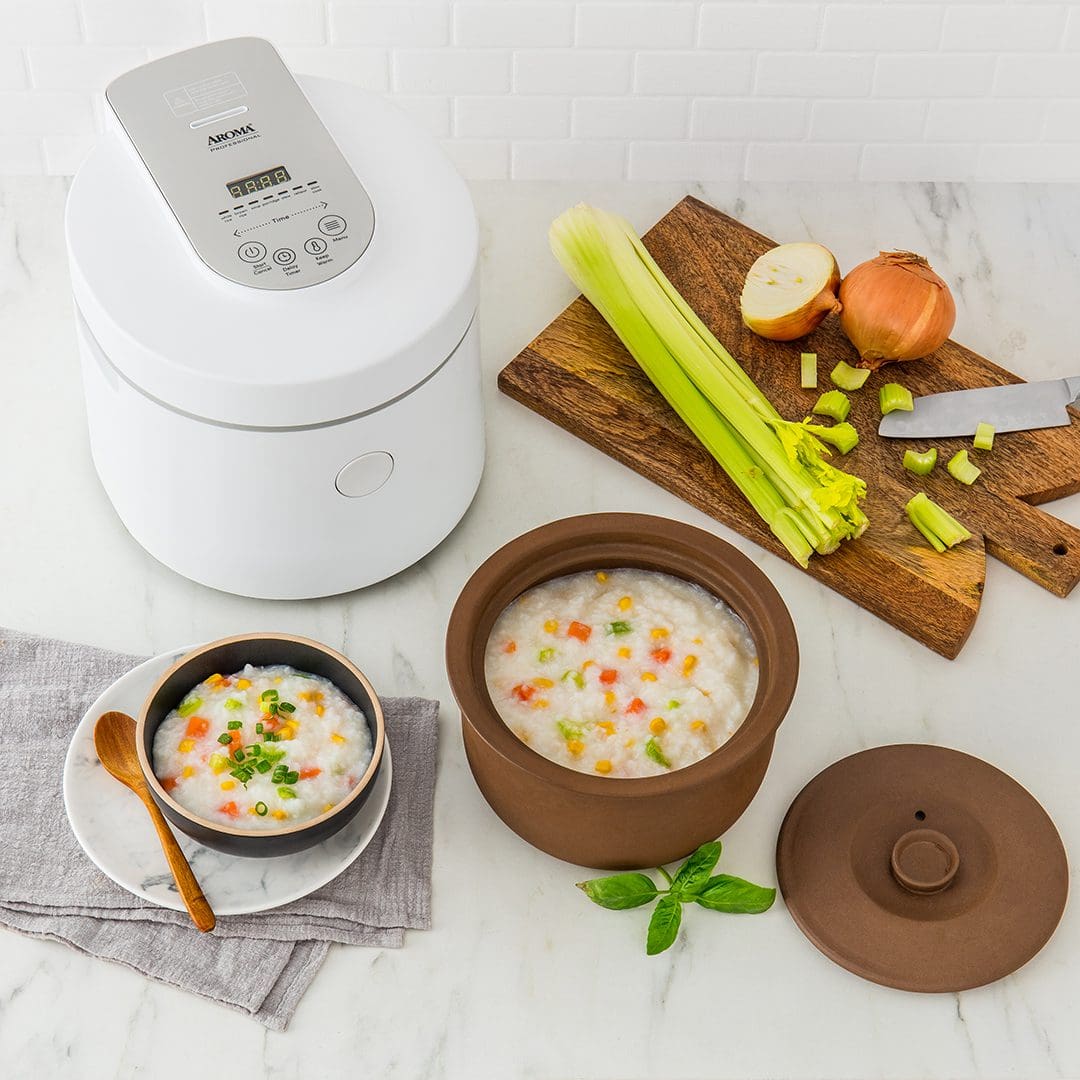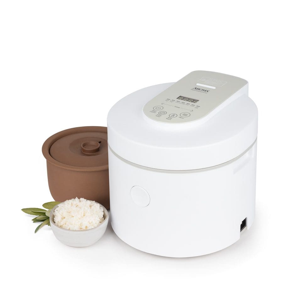 Prepare fluffy rice, flavorful stews, rich grains, and slow-cooked meals in a traditional Chinese purple clay pot. Unglazed, porous clay has amazing heat circulation and retention, so dishes cook faster and more evenly. With every use, the alkaline pot releases natural minerals and enhances the aroma of seasoned dishes. The outside of this modern white multicooker has a cool-touch body, push-release lid, and intuitive controls. Easily toggle through the rice cooker?s menu to choose from 7 smart cook settings or set a 15-hour delay timer. Temperature and moisture sensors track when your food is done and it automatically switches over to the keep warm setting. Clean eating is faster, easier, and more flavorful with Aroma. Now you can cook healthy one-pot meals in earthenware that adds even more nutrients. In addition to being non-toxic, uncoated, and naturally chemical-free, this purple clay pot is also PFOA- and PTFE-free. With Aroma, tradition meets innovation.11 lbs